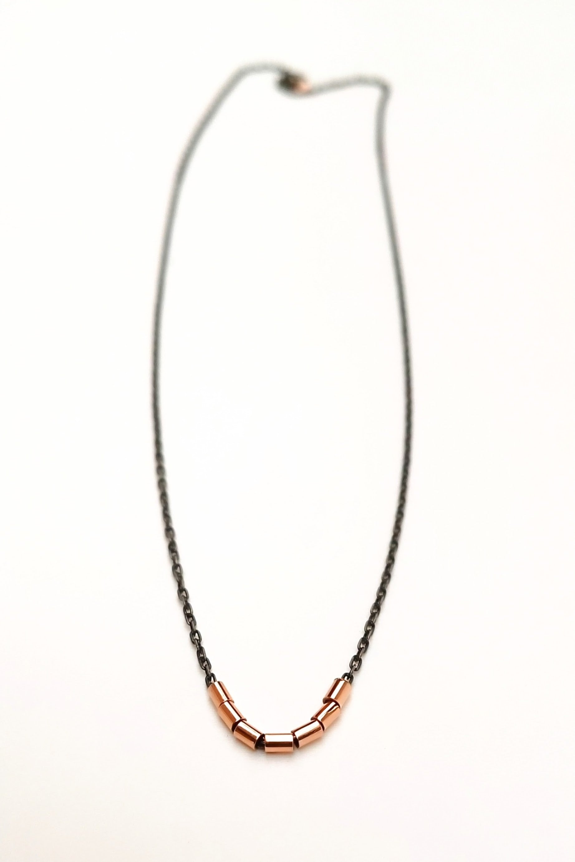 Pequeños tubos de oro rojo 18K, elaborados a mano, ensartados sobre una cadena de plata 925 ennegrecida al fuego.